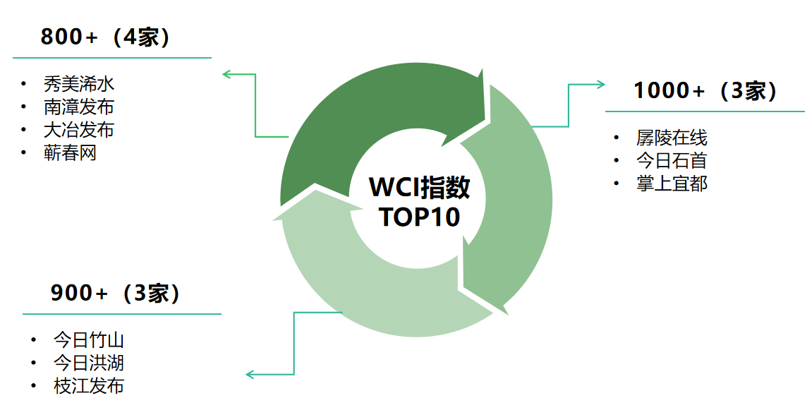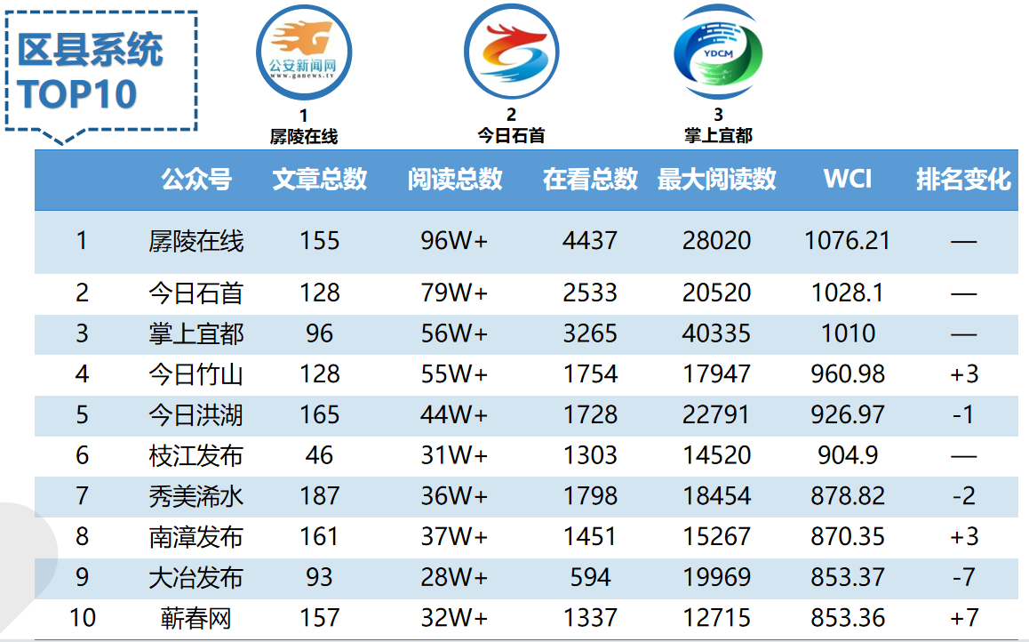 四是WCI指數(shù)整體表現(xiàn)不及預(yù)期,有8個(gè)上榜賬號(hào)WCI值出現(xiàn)負(fù)增長。如,本期WCI最高值(1076.21)與上期(1095.54)相比仍有19.32的差距。梳理發(fā)現(xiàn),本期上榜賬號(hào)細(xì)分指標(biāo)均略高于上期,差距主要在于頭條文章閱讀量和閱讀總量兩項(xiàng)上,如,賬號(hào)“秀美浠水”這兩項(xiàng)指標(biāo)分別減少了63321人次和3592人次,導(dǎo)致該賬號(hào)在發(fā)文量上漲的情況下,仍出現(xiàn)了WCI值減少57.36的情況,這說明后期各賬號(hào)還需注重頭條文章的質(zhì)量建設(shè);