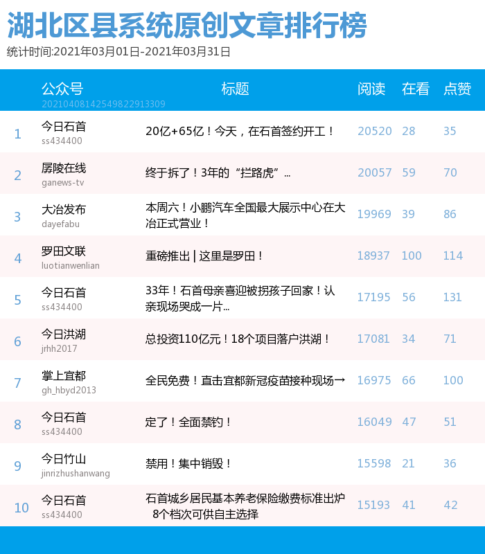 圖:湖北區(qū)縣微信排行榜3月榜單前十