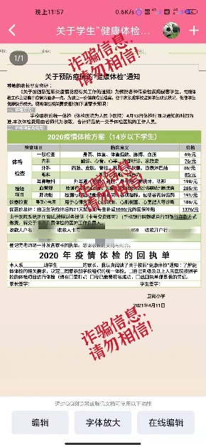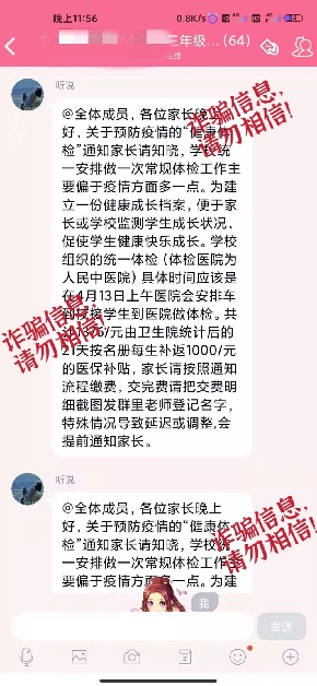 近日,安徽省合肥市的周先生收到一條來(lái)自孩子學(xué)校QQ群的消息,一名“老師”在班級(jí)群里發(fā)了一份關(guān)于“預(yù)防疫情的健康體檢”的通知,通知稱(chēng)要給學(xué)生們建立一份健康成長(zhǎng)檔案,便于家長(zhǎng)或?qū)W校監(jiān)測(cè)孩子成長(zhǎng)情況,學(xué)校組織了統(tǒng)一體檢,體檢費(fèi)用合計(jì)1376元,由衛(wèi)生院統(tǒng)計(jì),21天后按名冊(cè)每人補(bǔ)返1000元的醫(yī)保補(bǔ)貼。