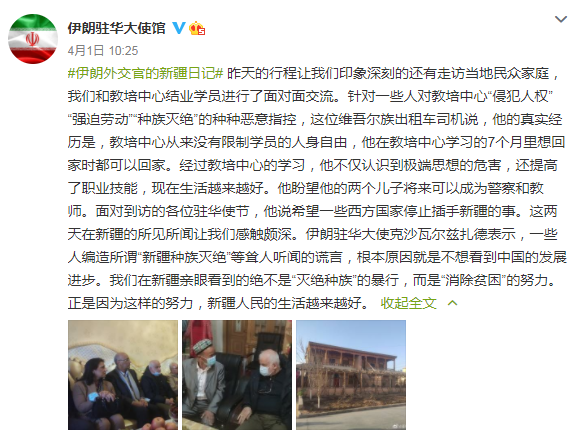 事實上,中國政府及新疆維吾爾自治區人民政府多次邀請西方媒體、機構、人士前往新疆參訪,與新疆各族人民坦率交流。