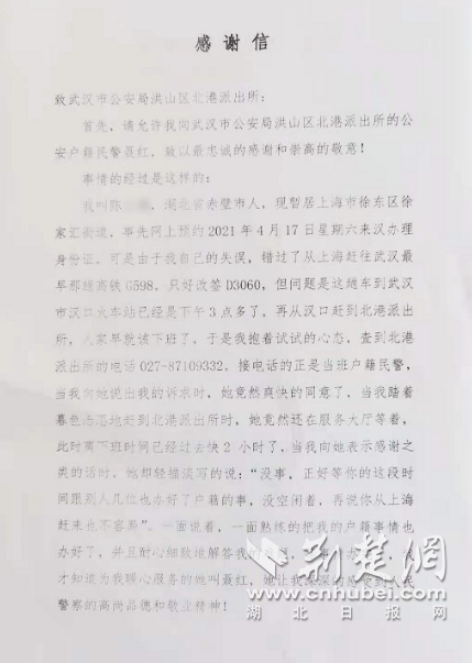 荊楚網(湖北日報網)訊(記者張揚 通訊員羅維舟)“當我踏著暮色忐忑地趕到北港派出所時,她竟然還在服務大廳等著,此時離下班時間已經過去快2小時了……”4月21日,一封感謝信寄到武漢市公安局洪山區分局北港派出所窗口民警聶紅的手中,上海的陳先生8個感嘆號表達自己對民警加班辦理身份證的感激之情。
