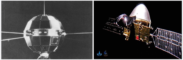 左為“東方紅一號”衛星,右為“天問一號”探測器。圖源:新華社