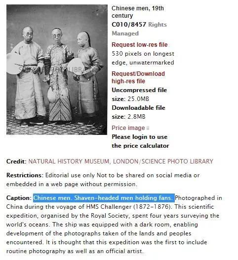 英國自然歷史博物館官網對這張照片的人物注釋卻只有簡單的一行文字:“中國男子,剃了頭的男人們拿著扇子”。所以,照片上的人物到底是誰,目前還難以知曉。