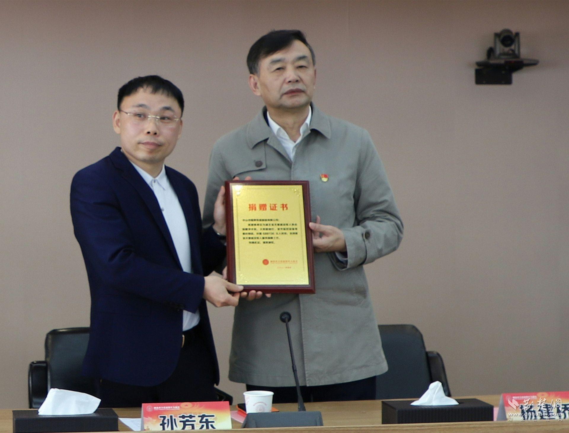 捐贈儀式上,中山市國美電器制造有限公司社會事務部部長孫芳東代表公司向省關愛退役軍人協會進行物資捐贈,省關愛退役軍人協會副會長楊建橋代表協會接受捐贈,并向孫芳東頒發捐贈證書。