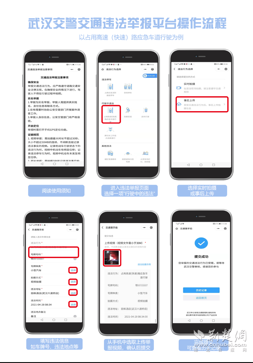 荊楚網(wǎng)(湖北日?qǐng)?bào)網(wǎng))訊(記者張揚(yáng) 通訊員焦宣)4月29日至5月7日,武漢交警“交通違法隨手拍”(簡(jiǎn)稱(chēng)“隨手拍”)升級(jí)版上線(xiàn)試運(yùn)行。試運(yùn)行期間,市民關(guān)注武漢交警微信公眾號(hào)后點(diǎn)擊菜單欄【警民互動(dòng)】?jī)?nèi)的【交通違法隨手拍】按鈕,即可對(duì)10類(lèi)交通違法行為“一鍵舉報(bào)”。試運(yùn)行期間,對(duì)于市民上報(bào)的交通違法典型案例,交管部門(mén)將通過(guò)武漢交警新媒體平臺(tái)予以曝光。