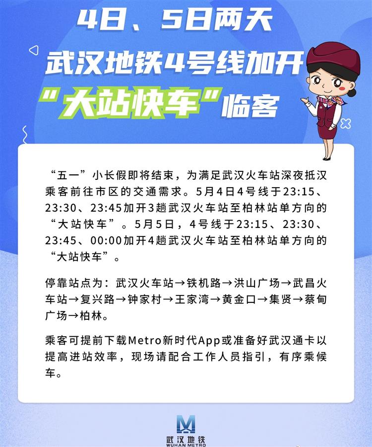 5月4日軌道交通4號線于23:15、23:30、23:45加開3趟武漢火車站至柏林站單方向的大站快車臨客。5月5日,軌道交通4號線于23:15、23:30、23:45、00:00加開4趟武漢火車站至柏林站單方向的大站快車臨客。??空军c分別為:武漢火車站→鐵機路→洪山廣場→武昌火車站→復興路→鐘家村→王家灣→黃金口→集賢→蔡甸廣場→柏林。末班車發出前,行車調度員根據現場客流情況在武漢火車站進行適當扣車,確保夜間抵漢乘客順利前往市區。