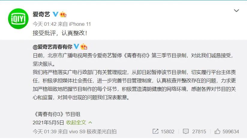 根據網絡視聽節目相關管理規定,北京市廣播電視局責令愛奇藝暫停《青春有你》第三季節目錄制。隨后愛奇藝視頻《青春有你3》欄目組發表聲明,從即日起中止該綜藝節目視頻錄制,對此誠懇接受,堅決服從。