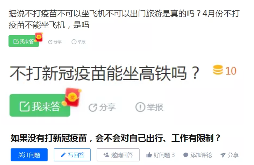 近日,在百度貼吧、知乎等各大平臺上,“不打疫苗會不會對出行有限制?”“據(jù)說不打疫苗不可以坐飛機(jī)?”“不打疫苗能坐高鐵嗎?”等問題頻繁出現(xiàn)。