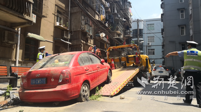 荊楚網(湖北日報網)訊(記者張揚 通訊員張鵬 段菲 董冠男 黃一燕)一輛車在老舊小區里停放了近4年,蓋在車上的車衣破損不堪,兩個后車輪癟得車轱轆著了地。5月8日上午10時許,記者隨江岸交通大隊四中隊民警,在發展大道的新江岸二村社區看到了這輛6年未年審、已報廢公示的僵尸車。
