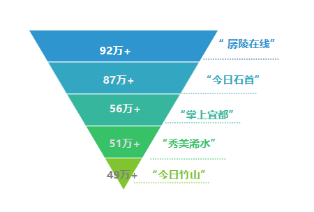 從閱讀總數來看,整體表現與上期差別不大,上榜區間保持在45萬到100萬之間。其中,“秀美浠水”憑借21萬+的閱讀增量成功躋身前五,“今日洪湖”閱讀總量減少9萬+,跌出榜單。