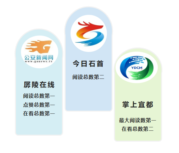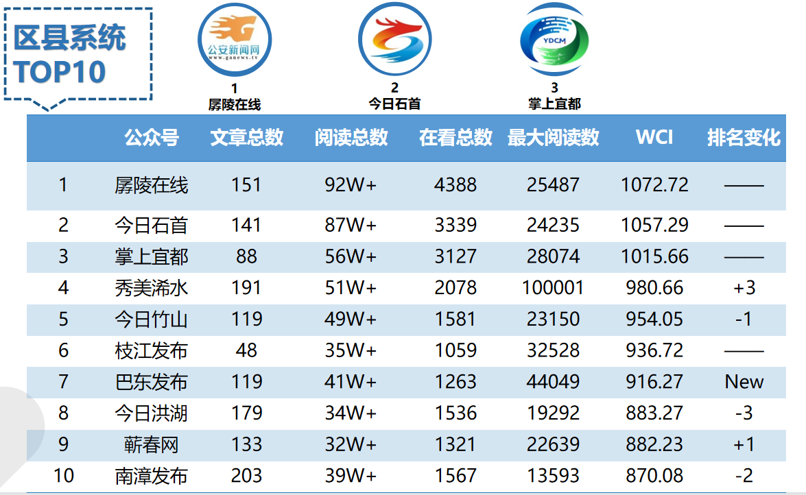 本期,“孱陵在線”“今日石首”“掌上宜都”繼續維持“鐵三角”組合,在閱讀總數、在看總數、點贊總數上占據前列。從具體排名來看,新晉賬號“巴東發布”和“秀美浠水”進步最明顯,排名分別上升21位和3位,主要得益于閱讀總量的大幅度提升,其中,“巴東發布”閱讀總量增加21萬、“秀美浠水”閱讀總量增加15萬,直接作用于賬號整體排名的提升。