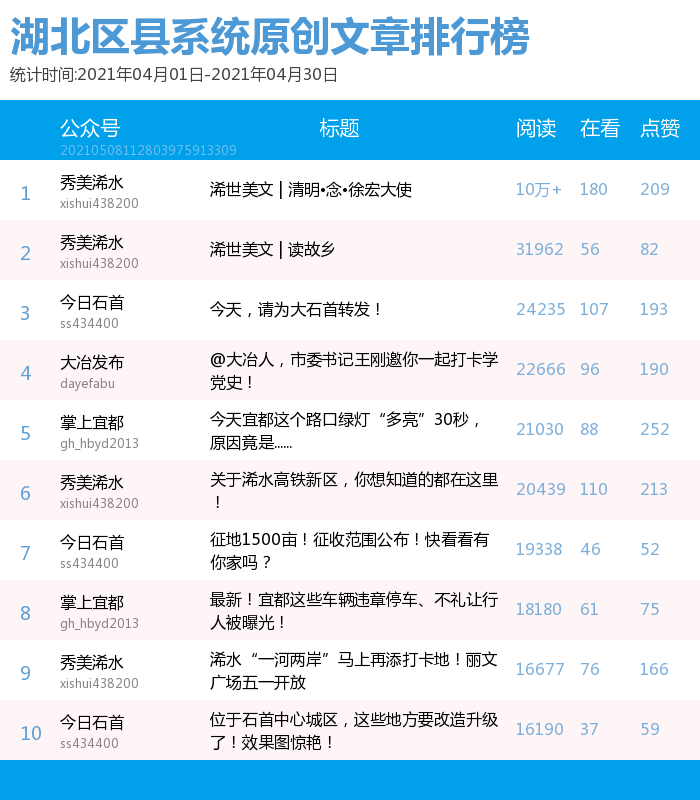 從原創文章排行榜來看,“秀美浠水”憑借多篇原創文章“霸榜”。具體來看,“秀美浠水”發布的系列文章《浠世美文|清明·念·徐宏大使》《浠世美文|讀故鄉》圍繞清明追思抒寫故鄉情懷,與讀者清明回鄉祭祖的心境形成了同頻共振的互動交流,成功登頂原創榜首。“今日石首”攜3篇本地化推文成為原創榜單表現較亮眼的單位。
