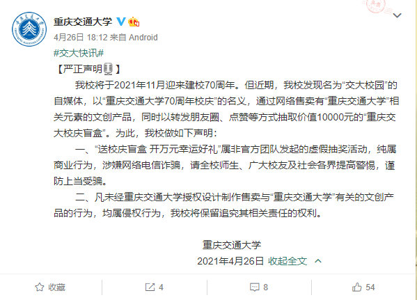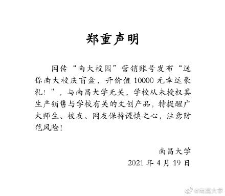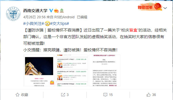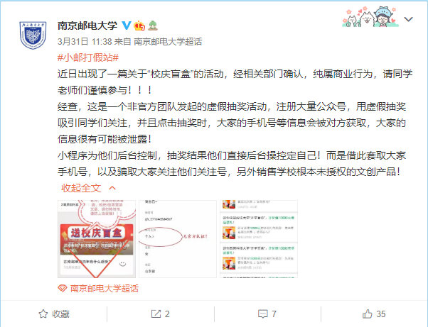 截止目前,重慶交通大學、西南交通大學、南昌大學、南京郵電大學等多所高校先后辟謠。經查,該活動為非官方團隊發起的虛假抽獎活動,注冊大量公眾號,用虛假抽獎吸引同學們關注,并且點擊抽獎時,大家的手機號等信息會被對方獲取,大家的信息很有可能被泄露!小程序為他們后臺控制,抽獎結果他們直接后臺操控定自己!而是借此套取大家手機號,以及騙取大家關注他們關注號,另外銷售學校根本未授權的文創產品!