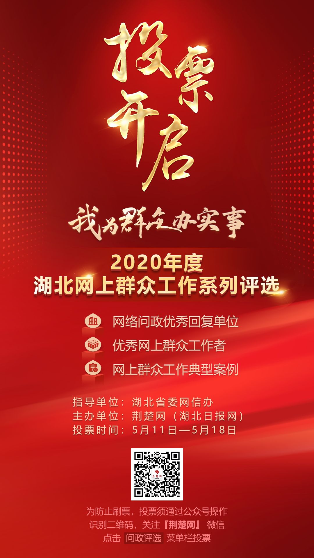 今起至5月18日24時(shí)是網(wǎng)絡(luò)投票環(huán)節(jié),為防止刷票,投票須通過(guò)荊楚網(wǎng)微信公眾號(hào)操作。投票方法:掃碼進(jìn)入“荊楚網(wǎng)”微信公眾號(hào),點(diǎn)擊公眾號(hào)底部菜單欄“問(wèn)政評(píng)選”,即可參與投票。每位網(wǎng)友每天可投票5次,每次每類候選對(duì)象最少選1個(gè)最多選10個(gè)。
