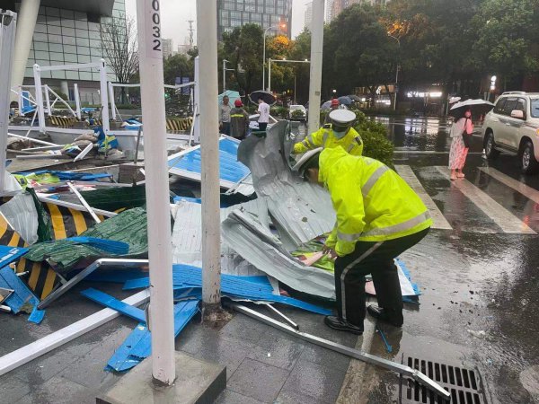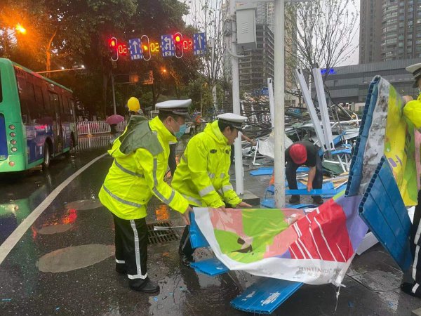 長江日報5月10日訊 5月10日下午,武漢出現大風暴雨天氣,京漢大道盧溝橋路路口施工圍擋被風吹倒,江岸交警現場清理,疏導車輛緩慢有序行駛,引導行人安全通行。