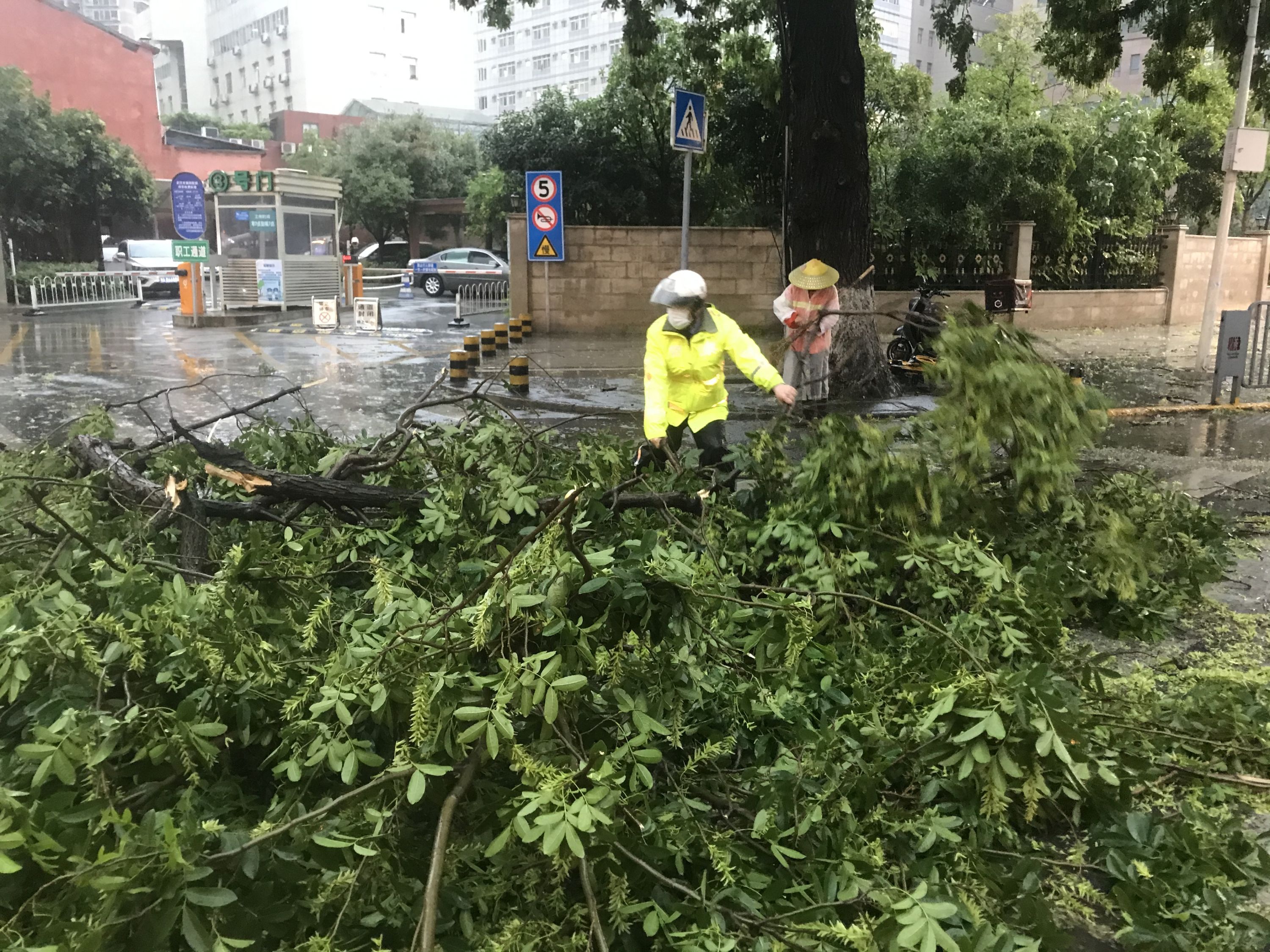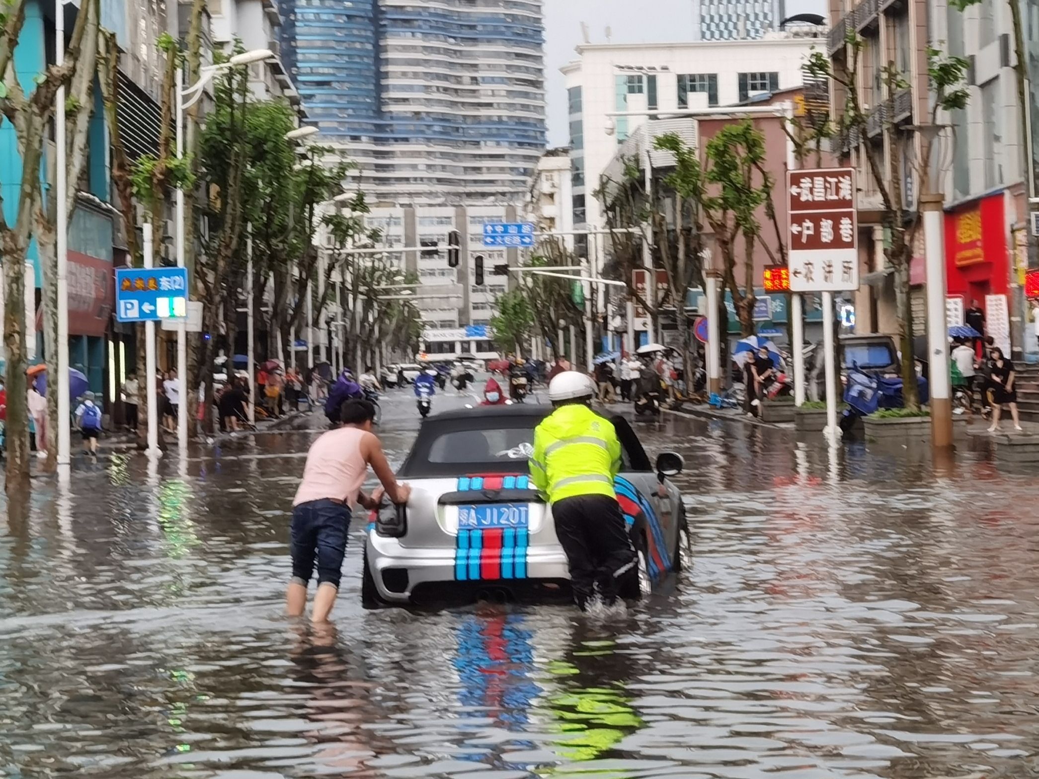 在臨江大道,武昌區(qū)交通大隊民警及時清理倒地護欄;在東西湖區(qū),漢警快騎隊員冒雨在護學崗執(zhí)勤,保障學校周邊交通安全暢通;在硚口區(qū)武勝路普愛醫(yī)院門口,狂風暴雨將樹枝擊斷,執(zhí)勤交警迅速疏散群眾,合力把樹枝拖到路邊;盡管漬水深度超過腳踝,洪山交警張超依然站在水中指揮交通,引導過往車輛通行,并及時將涉水拋錨車輛推至路邊。