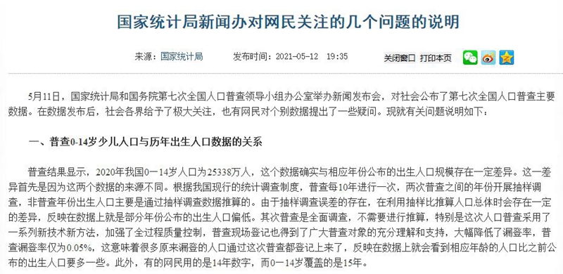5月11日,國家統計局和國務院第七次全國人口普查領導小組辦公室舉辦新聞發布會,對社會公布了第七次全國人口普查主要數據。在數據發布后,社會各界給予了極大關注,也有網民對個別數據提出了一些疑問。現就有關問題說明如下: