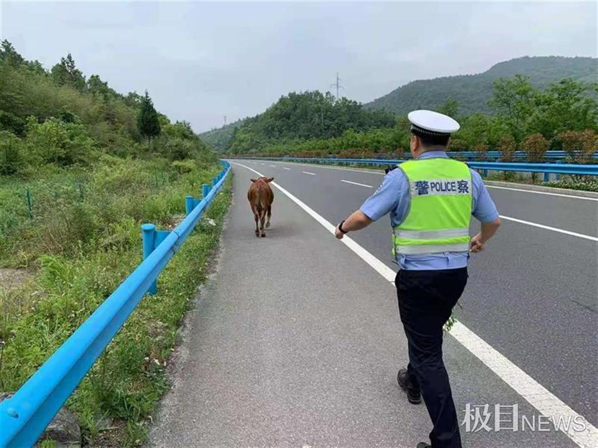 5月12日10時許,十堰市公安局高警支隊房縣大隊接110報稱,通省隧道出口附近有一頭小牛在路面行走,周圍未看到放牧人。