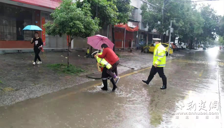 面對強降雨,經濟技術開發區交通大隊快速反應,漢警快騎機動中隊、事故中隊、軍山中隊、紗帽中隊等力量迅速到場開展道路管控、應急救援、交通保障等工作;大雨導致新洲區邾城、陽邏街道部分路段漬水,轄區交警迅速實施臨時交通管理措施,配合相關部門及時排漬,交警李江在轄區人民路值守時,一位老奶奶因急事欲通過漬水路段,交警背起她,將其送到安全地帶。