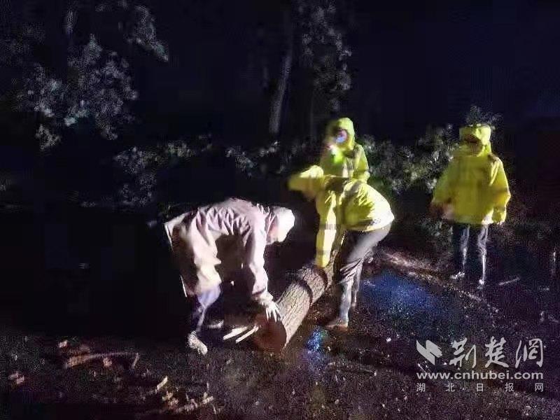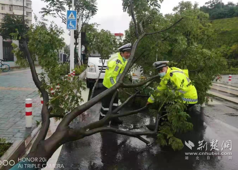 今早,武昌區東湖路受惡劣天氣影響,通行相對緩慢。武昌區交通大隊五中隊民警殷德祥迅速率警力現場排堵。他身著警用雨衣站在路面顯眼處,指揮車輛通行,上午10時許,降雨逐漸減小,路面通行有序,殷德祥已全身濕透,他叮囑隊員:做好準備,隨時待命。在東湖新技術開發區,交警劉德照出警途中,見人行道旁大樹被連根拔起,倒在道路中間,影響過往車輛及行人通行,他帶領隊員徒手將倒樹拖移至路邊,并聯系園林部門及時處理。在江漢區,交警和水務部門人員協力合作,加緊抽排漬水,引導車輛文明禮讓行駛,道路交通井然有序。