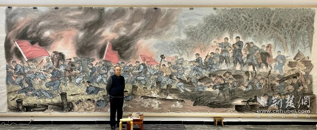 直播期間,李乃蔚向網友展示了近百幅作品。其中,一幅長達8米、寬2.8米的歷史巨作——《劉鄧大軍千里躍進大別山》感情濃烈,讓人身臨其境。為重現具有時代特征的解放軍英勇戰斗的集體群像,李乃蔚查閱了大量關于解放戰爭的史料,設身處地地體味革命戰爭的情景,連續三個月往返于大江南北(漢口家中—武昌墨語堂美術館畫室),爬高下低,精心刻畫。