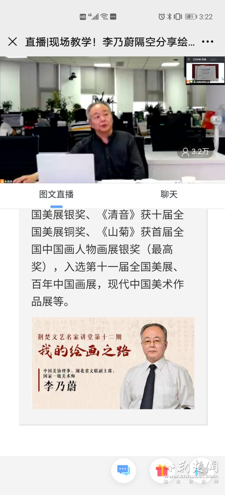 荊楚網(湖北日報網)訊(記者張揚 通訊員張靜)一張白紙,需要多少筆墨,才能繪就入骨傳神的畫作?一位畫家,需要怎樣磨礪,方可邁進國家美術的殿堂?5月13日,中國工筆畫知名畫家李乃蔚做客“荊楚文藝名家講堂”(第十二期),與9萬余名網友分享他秉承傳統、融合中西的繪畫之路。