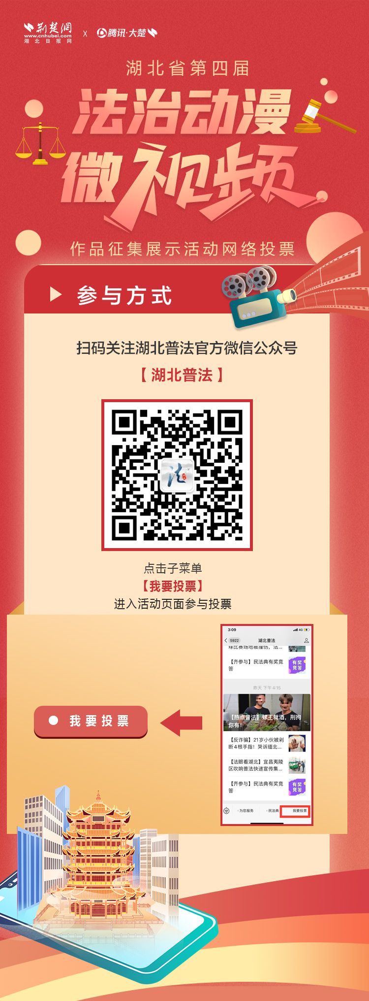 網絡投票活動從5月17日持續(xù)到5月31日,公眾可通過湖北普法公眾號進行投票。進入湖北普法微信公眾號頁面,點擊菜單欄中的“我要投票”即可參與網絡投票(每個用戶每天限投1次,每次可以勾選1-10部作品)。