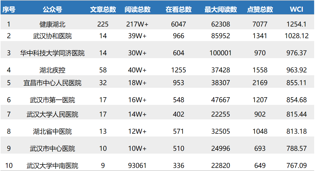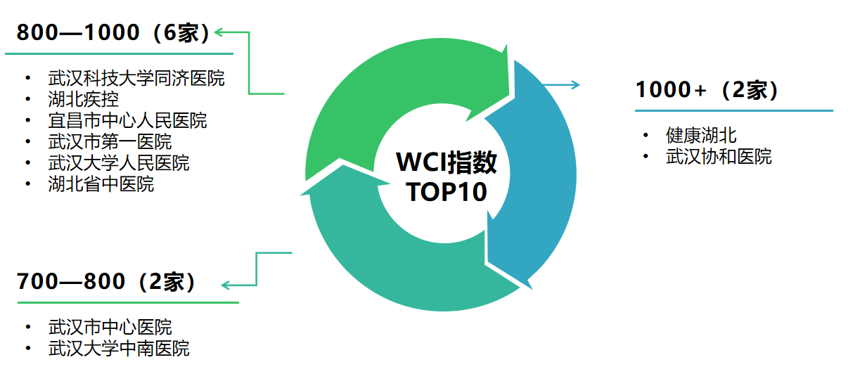 從WCI指數(shù)來看,本期TOP10賬號WCI值分布中堅力量相對充實。其中,超過1000的賬號從上期的3家減少至2家,“武漢科技大學同濟醫(yī)院”進入中部區(qū)間;800-1000區(qū)間有6家,“武漢大學中南醫(yī)院”跌落至尾部區(qū)間。整體來看,上榜賬號之間分值差別較大,說明中尾部賬號還有上升空間。