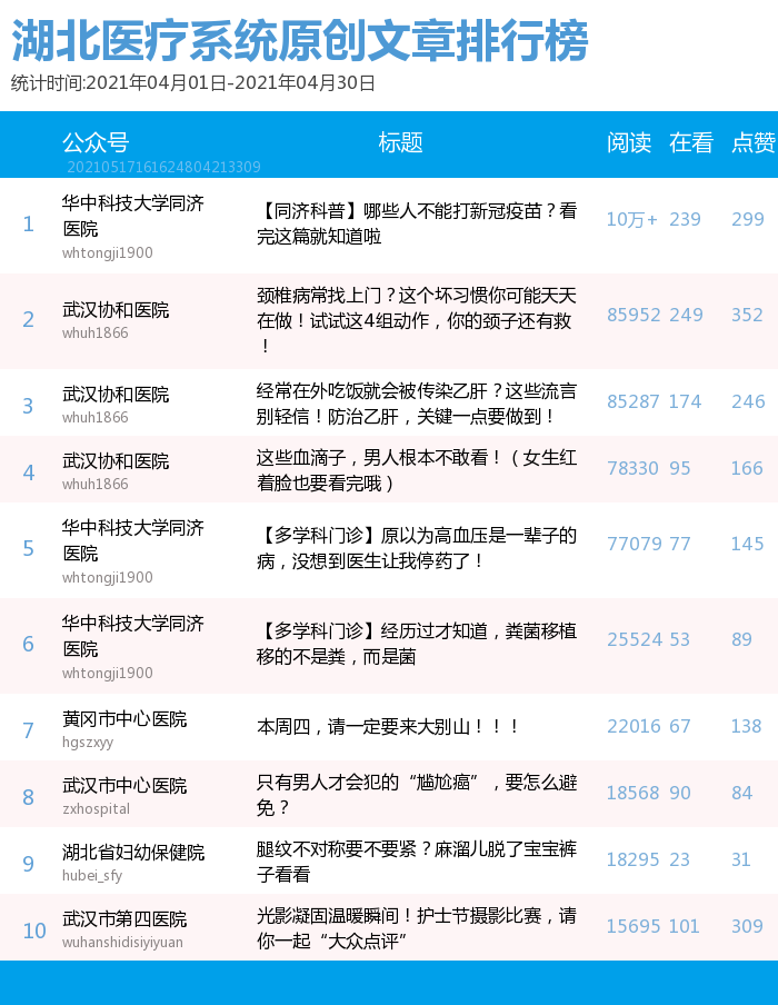 圖:湖北醫(yī)療微信排行榜4月榜單前十