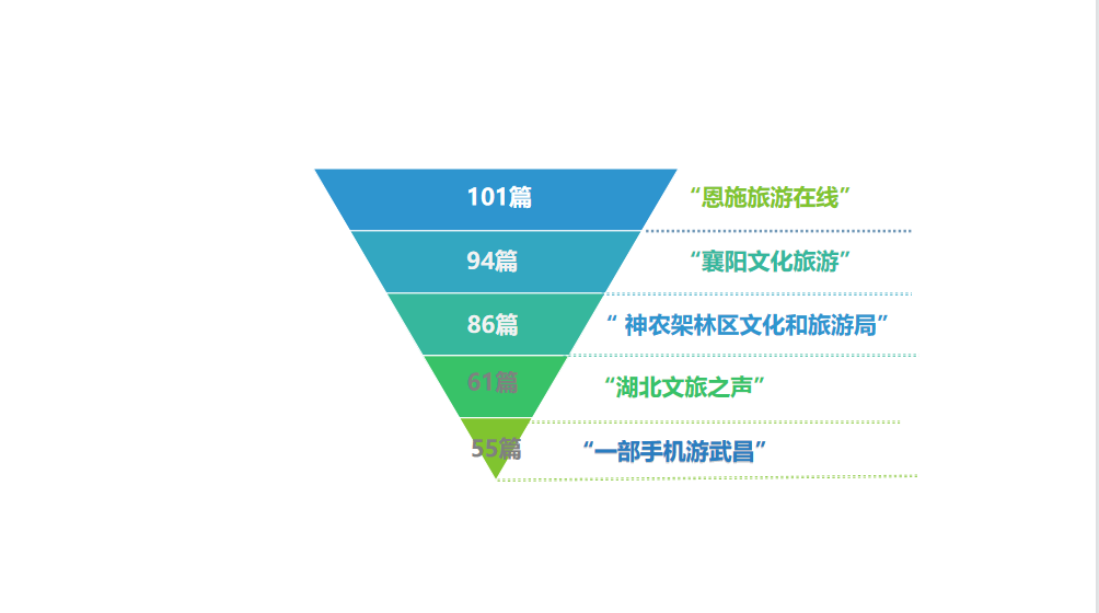 從文章發布總數來看,整體數值較3月有100篇左右的增加。“恩施旅游在線”“襄陽文化旅游”“神農架林區文化和旅游局”“湖北文旅之聲”和“一部手機游武昌”以101篇、94篇、86篇、61篇和55篇依次排名前五。以往不常上榜的“恩施旅游在線”2月進入前五后,3月躍居榜首,4月蟬聯第一名。