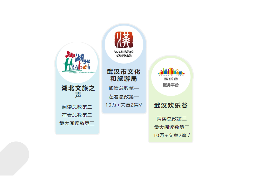 白云黃鶴傳千古,高山流水覓知音。4月12日,以“英雄的湖北:浴火重生 再創輝煌” 為主題的外交部湖北全球推介活動在北京舉行,湖北再次站在了全球的聚光燈下。5月19日,湖北旅游政務微信4月榜發布,湖北文旅類政務微信抓住推介時機,大力推廣各地元素,一起推高了本期指數。其中,“武漢市文化和旅游局”WCI指數蟬聯榜首,“湖北文旅之聲”和“武漢歡樂谷”位居第二和第三,本月原創文章排行榜前20名依舊被“武漢市文化和旅游局”獨占。