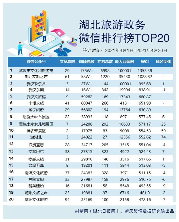 湖北旅游政務微信WCI指數TOP20具體排名如下: