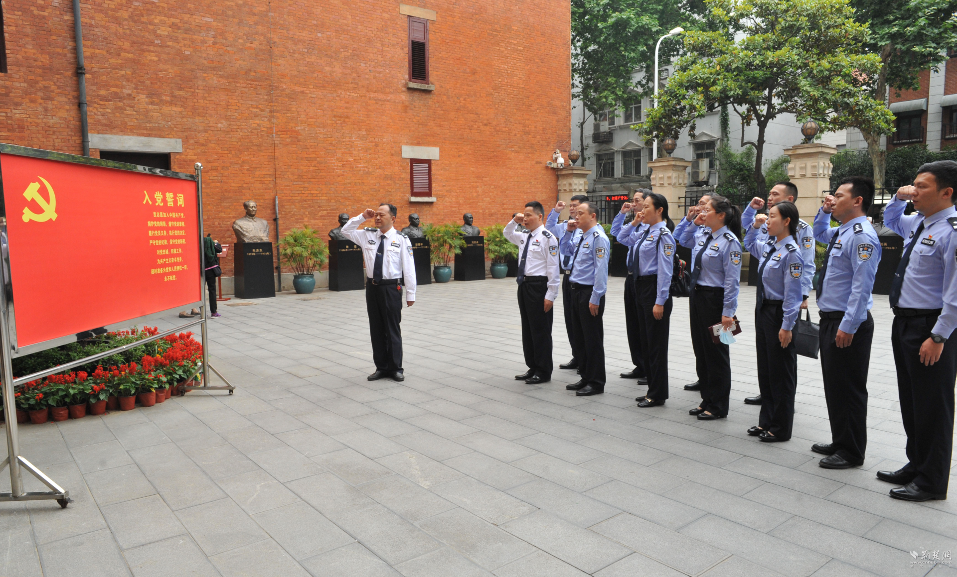 在紀念館門前,組宣處黨支部書記、處長黃勇峰帶領全體黨員面向黨旗莊嚴宣誓,以錚錚誓言表達對革命先烈們的無限緬懷和為黨的監獄事業奮斗終生的堅定決心。