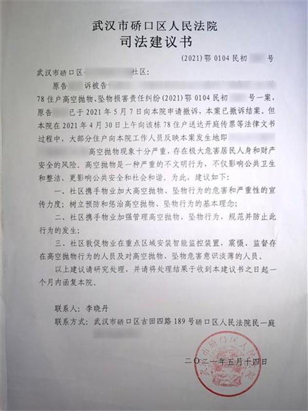 之后,李曉丹一行又來到了社區、物業公司和相關管理部門,向相關單位的負責人員當面送達了司法建議函,要求相關部門要積極從居民普法、增設監控、加強管理等方面履行職責,進一步加強居民對高空拋物危害的認識,切實保護好人民群眾的頭頂安全。
