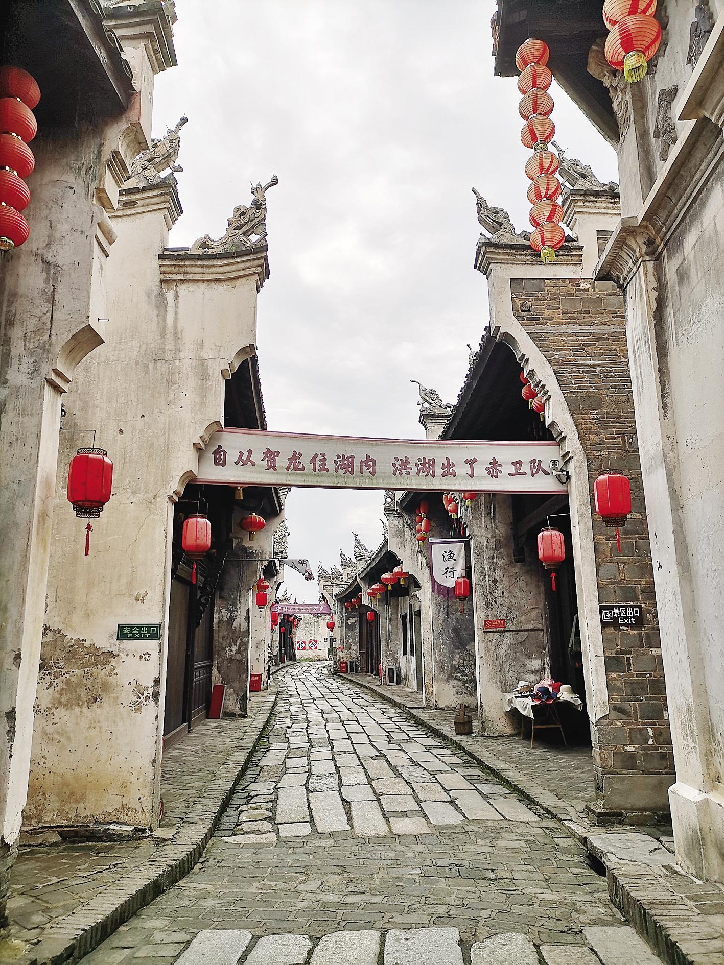 窄窄的街道向內延伸,沿途還懸掛著“自從賀龍住湖內,洪湖出了赤衛隊”“湘鄂西蘇維埃省政府萬歲”“中國工農紅軍萬歲”等標語。