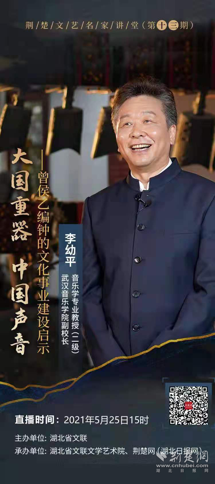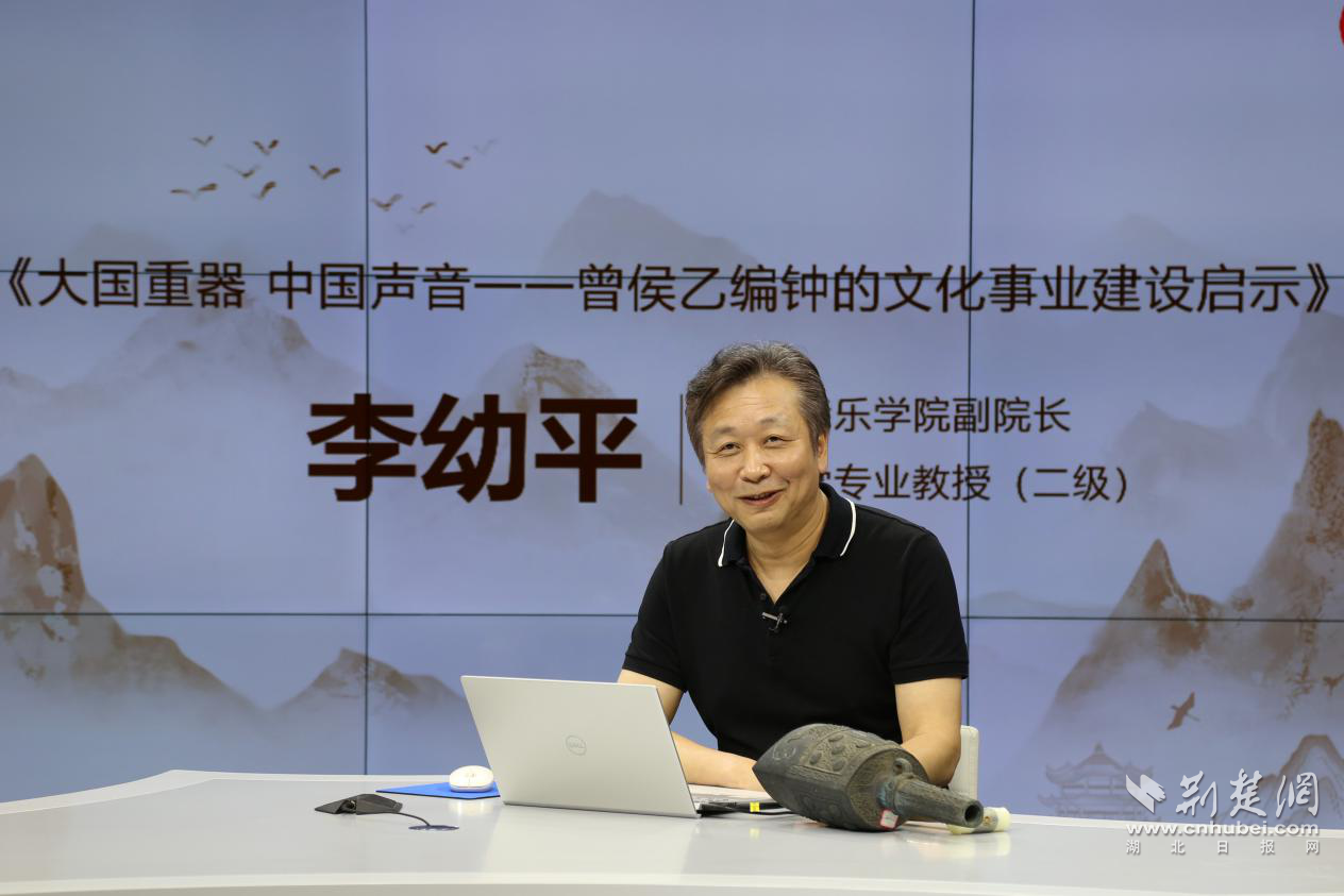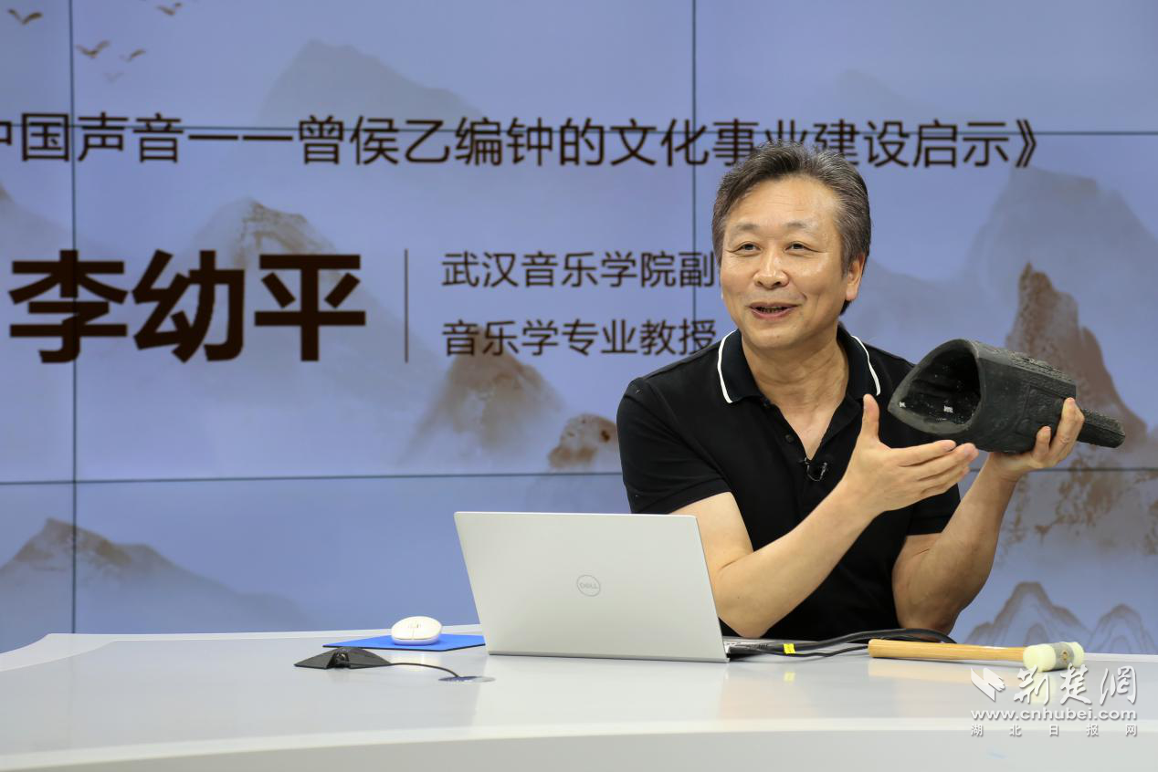 荊楚網(湖北日報網)訊 (記者張揚 實習生劉越)鐺、鐺……編鐘敲響的一刻,鮮花、火箭刷屏,直播間里頓時熱鬧起來。5月25日,武漢音樂學院副院長李幼平做客荊楚文藝名家講堂,講述曾侯乙編鐘的“前世今生”,他特意帶來一只曾侯乙編鐘復制品,現場奏響2400多年前的天籟之音,令十萬余網友聞之沸騰。