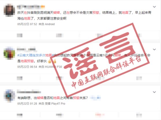 此次云南大理地震前一天,云南金平蝴蝶谷出現(xiàn)1.5億只蝴蝶羽化成蝶的自然奇景。面對(duì)這十年一見(jiàn)的奇觀,有人臆測(cè)這是蝴蝶在預(yù)警地震,還有的甚至直接編造這次地震是蝴蝶引起的“蝴蝶效應(yīng)”。
