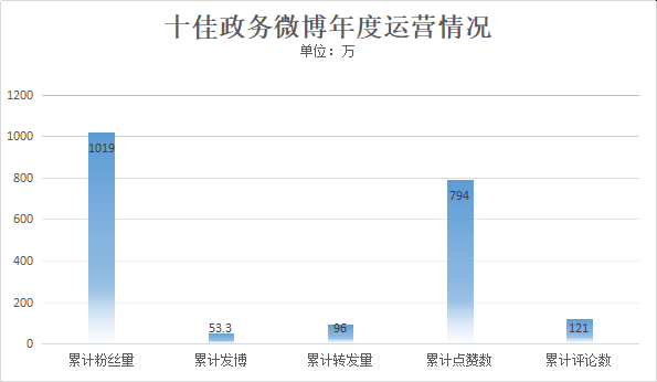 “十佳”政務微博累計粉絲數超1019萬,2020年“十佳”微博號平均BCI為1662.68 ,累計發布微博53.3萬篇,每個微博號日均發布量超145篇;年度所有微博的累計轉發量達96萬次,累計獲得點贊數為794萬,累計評論數超121萬。