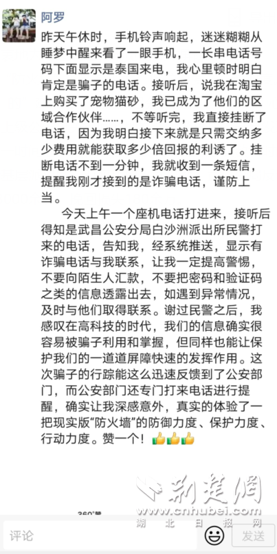 荊楚網(湖北日報網)訊(記者張揚 通訊員卞鴻飛) 剛接到騙子來電,一分鐘后就接到反電詐短信提醒。次日轄區派出所民警又打來電話,開展反詐宣傳,再次提醒小心防范,武昌居民羅女士親身經歷警方看不見的“反詐防火墻”,在微信朋友圈里為身邊的保護神點贊。