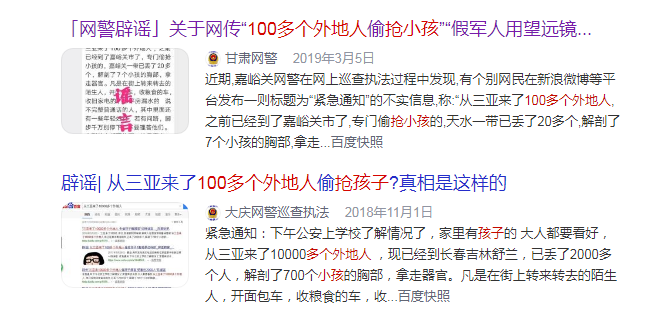 經搜索發現,這個“100多個外地人偷或搶小孩”的謠言已經在多個地方,換著花樣傳了多年。有說這“100多個外地人”來自三亞,也有說來自呼和浩特,還有說來自新疆等。而被傳搶孩子的地方就更多了,有云南西雙版納、楚雄、浙江龍游、廣東珠海、惠州、湖北鄂州、四川雅安、甘肅天水、山西忻州、山東菏澤等10多個地方。