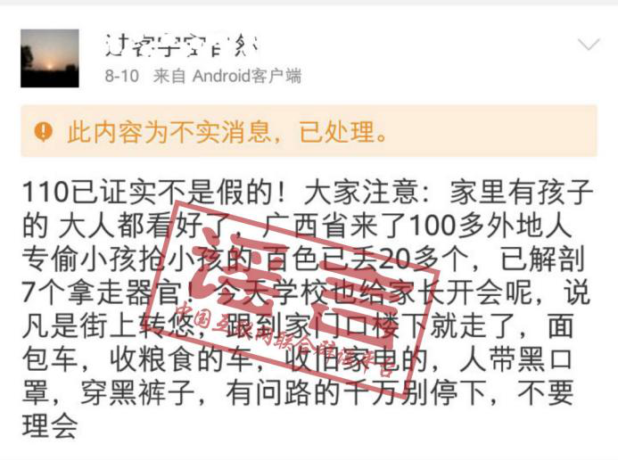 經查證追溯發現,網絡上較早出現該謠言的時間是2015年8月份,有網民發布關于“廣西省來了100多外地人,專偷小孩搶小孩的,百色已丟20多個,已解剖7個拿走器官”的消息。經柳州網警核查,此消息為虛假消息。