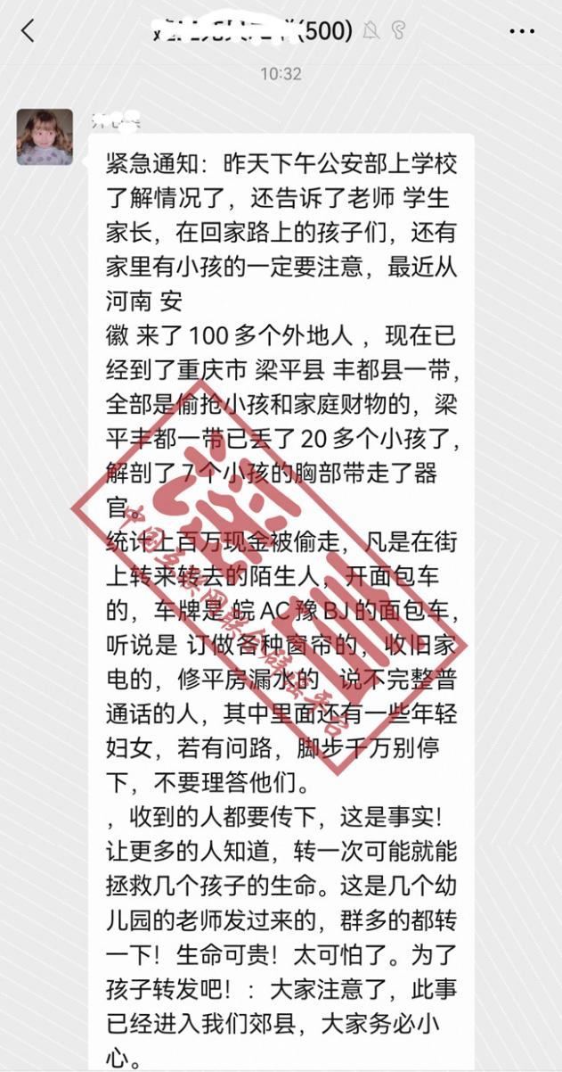 近日,中國互聯網聯合辟謠平臺接到網民舉報,稱網上有多個群在轉發“從河南、安徽來了100多人搶小孩”等信息。傳言駭人聽聞,稱100多外地人現在已經到了重慶,梁平、豐都一帶,已經發現丟了20多個小孩,7個小孩器官被摘取……