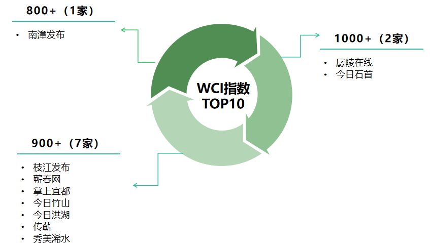 從WCI指數來看,本期上榜單位WCI值整體得分上漲,主要分布在900-1000區間,7家單位中有2家單位WCI增量突破100,分別是“蘄春網”上漲106.2、“傳蘄”上漲179.4。其中,“蘄春網”的上漲主要得益于發文總量的增長帶動文章閱讀總數的上漲,兩項指標均取得了細分類別第一的好成績。