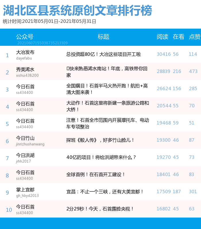 從原創文章排行榜來看,“今日石首”攜5篇原創文章占據榜單半壁江山,成績亮眼。入榜文章主要有《全國矚目!石首半馬火熱開跑!航拍+高清大圖來襲!》《大動作!石首這里將新建一條旅游公路和大橋!》《全球首例!在石首開工建設!》《2分29秒!今天,石首露臉央視!》等,文章標題主要有以下特點可供其他單位參考: