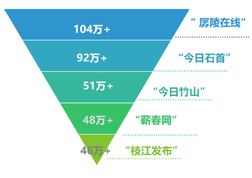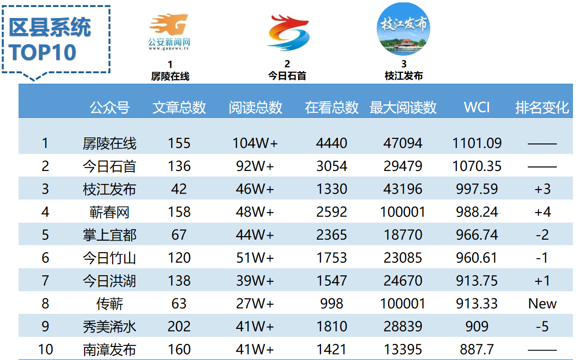 從具體排名來看,本期榜單變動較大,“枝江發布”“蘄春網”排名分別上升3位和4位,成功入列Top5排名;“秀美浠水”和“掌上宜都”分別下降5名和2名;其余各家單位排名均為上下1名的小幅度波動。此外,“傳蘄”作為區縣新晉單位,首次上榜就取得了第8名的好成績,勢頭強勁,后續仍有上升空間。