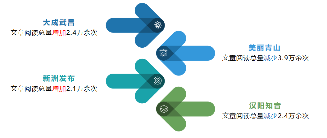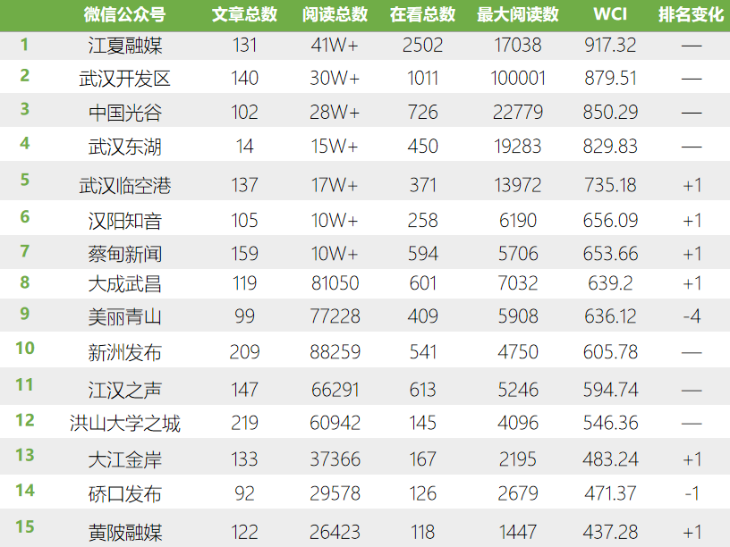 本月各家賬號閱讀總量增減參半,增長排名前列的有大成武昌、新洲發(fā)布、江夏融媒、江漢之聲等,增長達(dá)到1至2萬;下降狀況達(dá)到萬以上量級的有美麗青山、漢陽知音、武漢東湖,其中,美麗青山閱讀量下降近4萬次,是變動量最大的賬號,直接導(dǎo)致了WCI得分的較大下滑。觀察近幾期榜單發(fā)現(xiàn),“美麗青山”的排名狀況相較變動較大,呈現(xiàn)出較大幅度的上升和下跌,成績穩(wěn)定性較弱,還需發(fā)揚(yáng)優(yōu)勢,保證賬號長期穩(wěn)定向好發(fā)展。