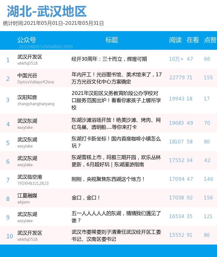 本期微信文章閱讀量前十榜中,“武漢開發(fā)區(qū)”延續(xù)上期態(tài)勢,以《經(jīng)開30周年:三十而立,輝煌可期》文章成為唯一一篇閱讀量達(dá)10萬+的賬號。文章講述經(jīng)開30年來的發(fā)展歷程和取得的成績,展望未來努力打造“實力車谷”“動力車谷”“活力車谷”“魅力車谷”的美好愿景,爭當(dāng)建設(shè)現(xiàn)代化大武漢排頭兵。“武漢東湖”共有4篇文章上榜,內(nèi)容均為打卡等游玩類信息,武漢入夏,東湖優(yōu)美的自然景觀以及游樂場所吸引眾多市民游覽玩樂,東湖沙灘浴場、咖啡小鎮(zhèn)、瑪雅海灘等信息獲得較多關(guān)注。其他關(guān)注度較高的文章涉及基建、教育、人事變動等多個方面,各賬號呈現(xiàn)遍地開花態(tài)勢。