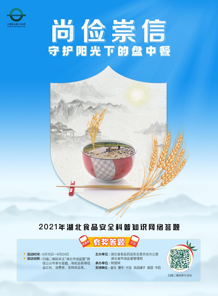 此次答題活動以“尚儉崇信,守護陽光下的盤中餐”為主題,答題時間為6月15日—6月24日,答題內容包括食品安全科普知識及相關法律法規。活動期間,關注“湖北市場監管”或“荊楚網”微信公眾號,點擊菜單欄中的“食安答題”即可參與答題。