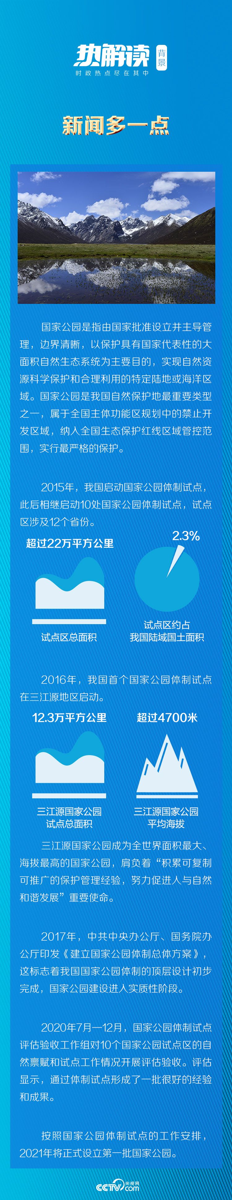 國(guó)家公園保護(hù)的是全國(guó)最精華、最珍貴、最核心的自然生態(tài)資源,是生物多樣性最富集的地方。建立國(guó)家公園體制,是黨中央站在實(shí)現(xiàn)中華民族永續(xù)發(fā)展的戰(zhàn)略高度作出的重大決策,是生態(tài)文明和美麗中國(guó)建設(shè)具有全局性統(tǒng)領(lǐng)性和標(biāo)志性的重大制度創(chuàng)新。