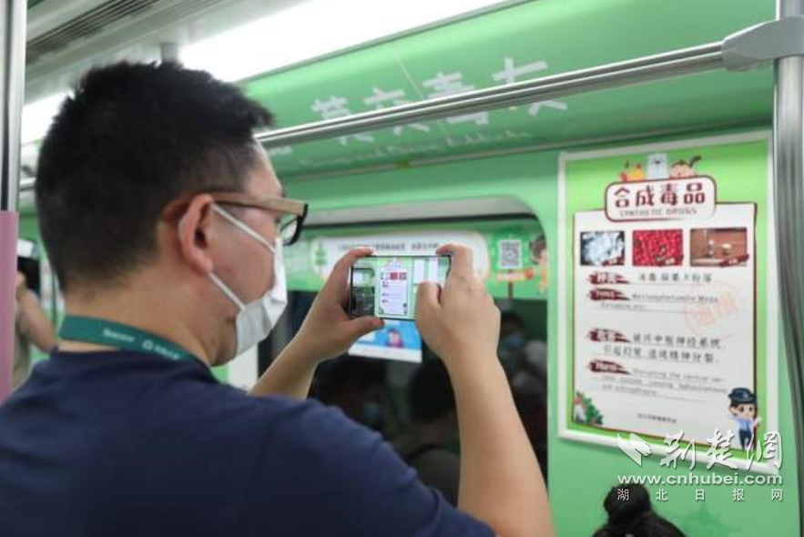 記者在車廂內看到,車頭、車尾設有《武漢市禁毒條例》普法宣傳,四節車廂分別有識毒篇、防毒篇、拒毒篇及禁毒防毒問答題,在防毒宣傳車廂內印有“只嗦米粉,不嘬白粉”,漢味十足的方言標語引來了不少乘客駐足拍照;在車廂地板上印有各類毒品展示圖片,提醒市民注意辨別的同時,也寓意全民將毒品踩在腳下。